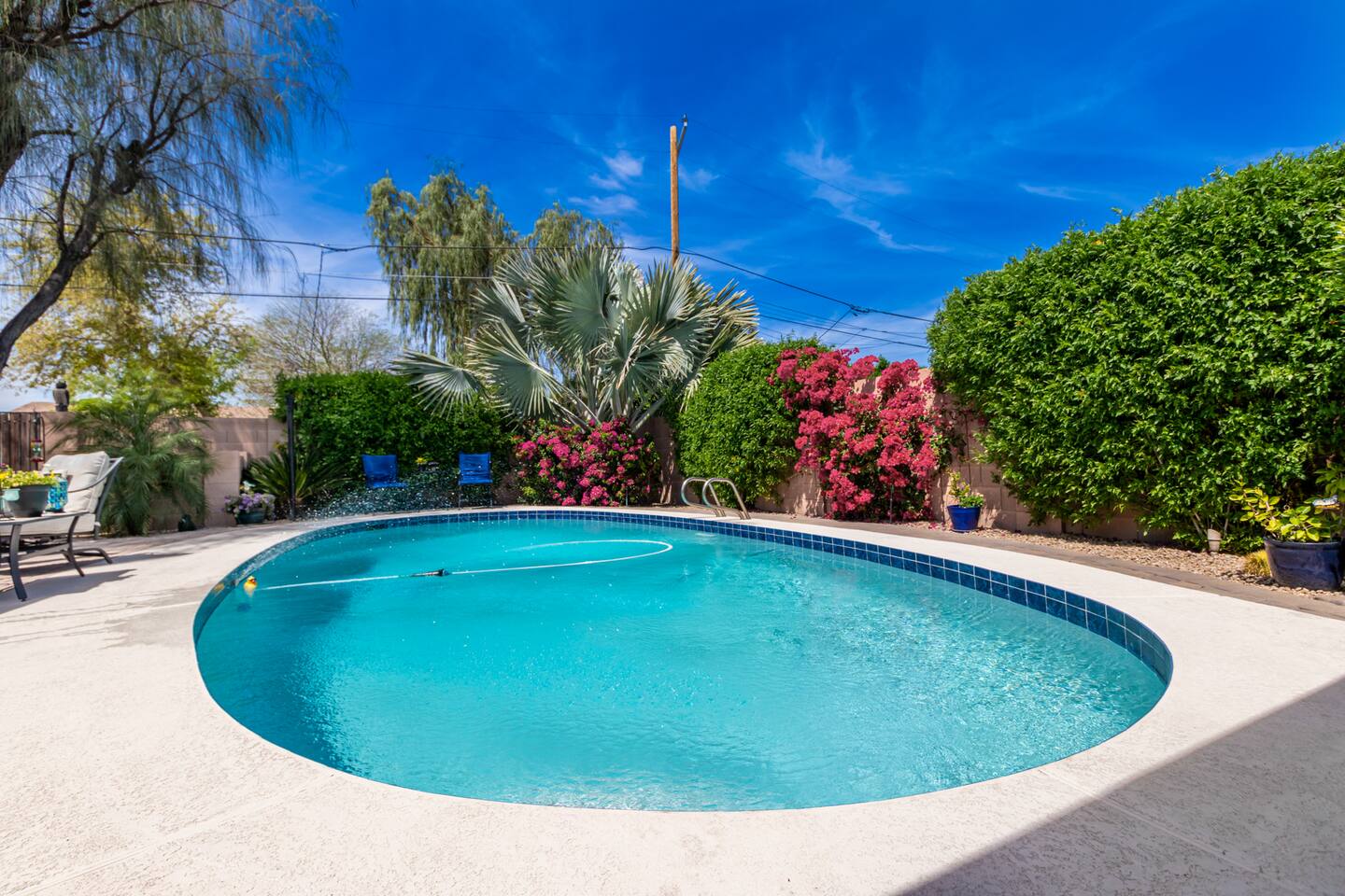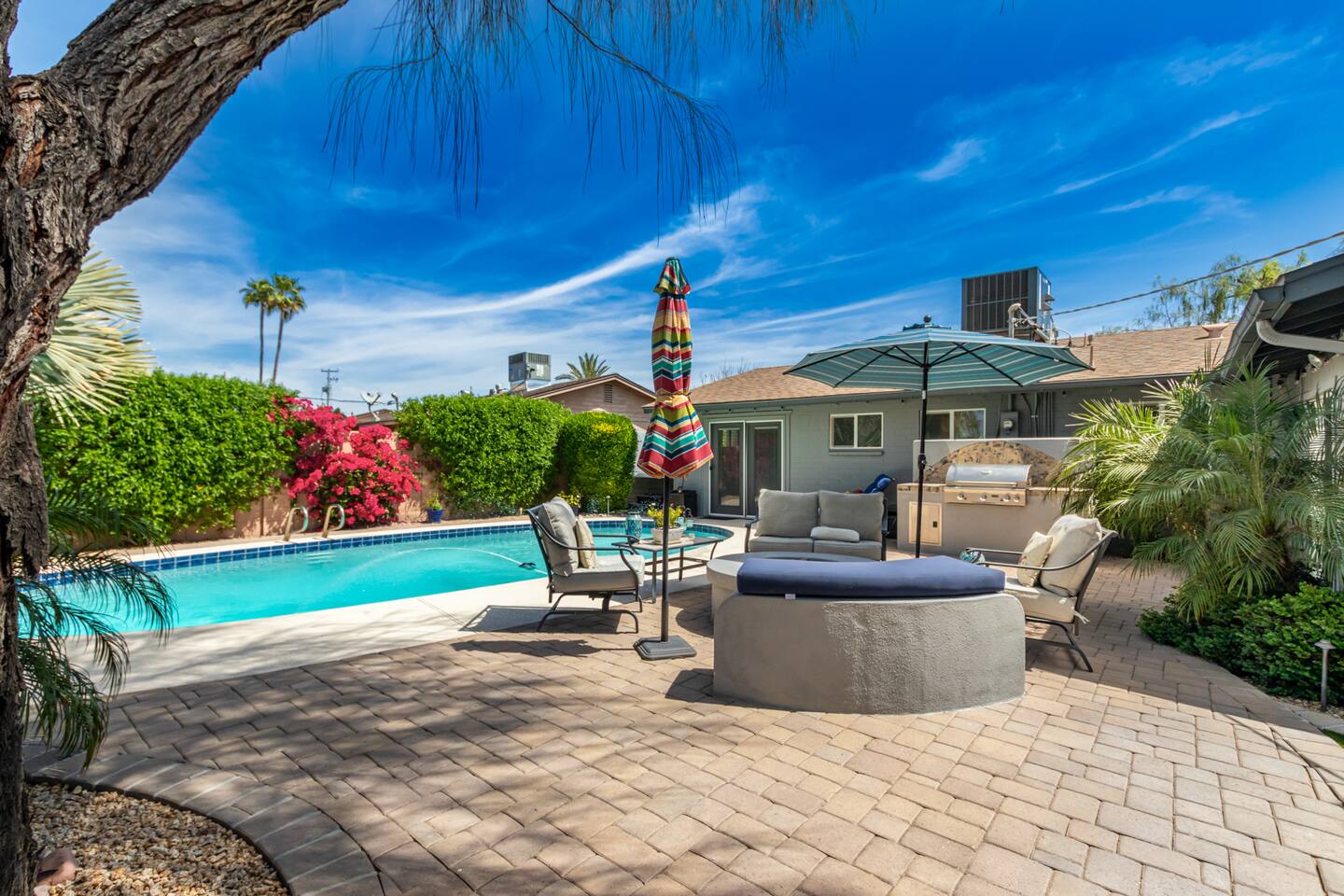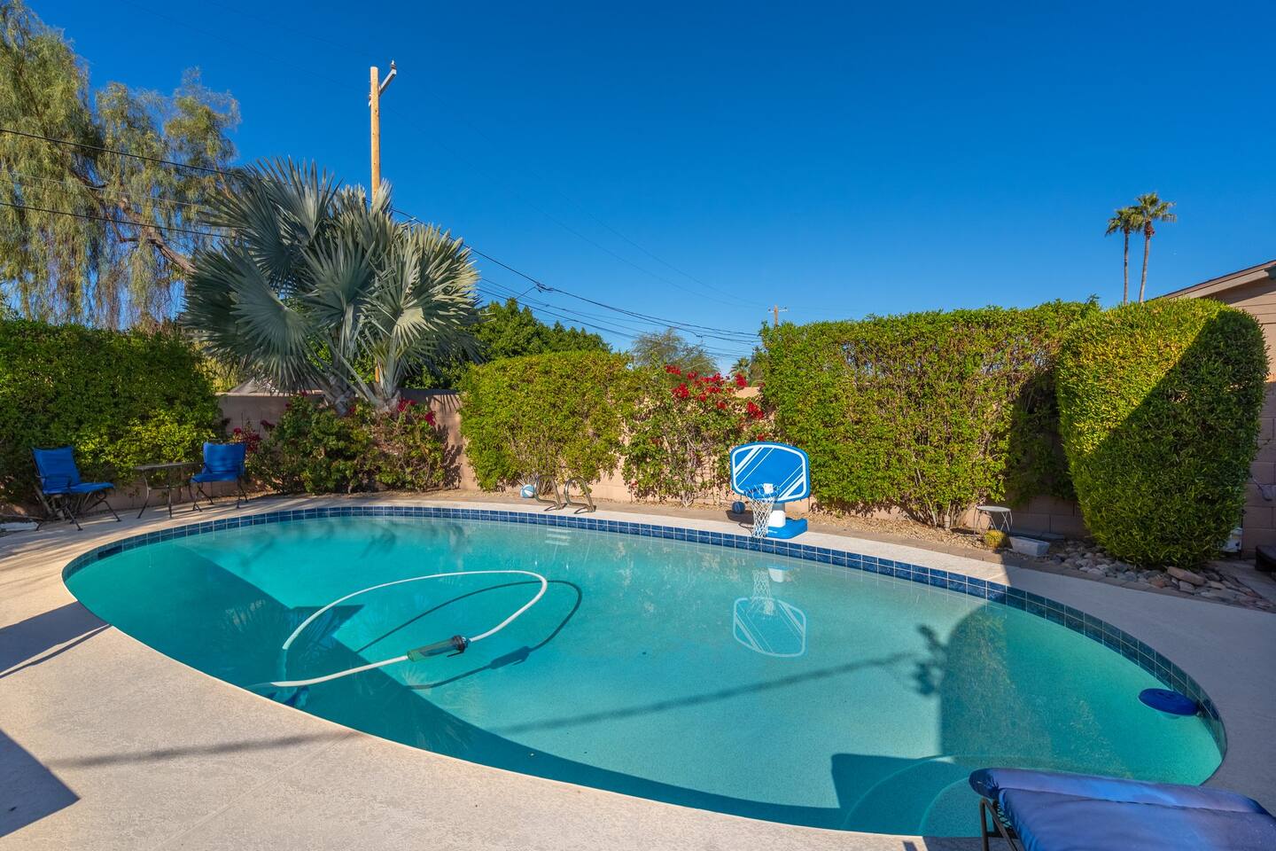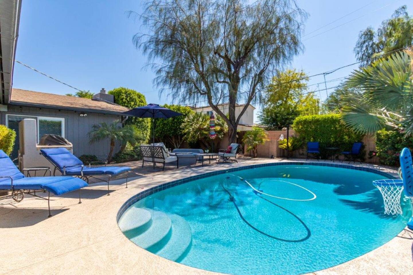 This inviting private residence has a covered carport, a 1-car garage and available parking on the street without any needed passes. There is a front patio area with tables and seating in a relaxed environment. The door has an August Lock with keypad access. As you enter the home, you are invited into a warm space with a large dining table with with seating for 8 people and plenty of open space. There are 3 bedrooms to the right including a master bedroom with a king-sized bed, private bathroom with a shower, and large double doors opening directly out to the pool and back yard. The second bedroom has 2 queen-sized beds and the 3rd bedroom has a comfortable hide away bed couch and office space. The home also has a roll-away twin bed as well available. All the rooms have 43-inch Samsung Smart TVs and Amazon Echos which can be used separately or linked together. The TV/Entertainment room has a 65-inch Samsung Smart TV with a VIZIO Elevate Home Theater Surround Sound, 2 comfortable theater chairs and a love-seat and sofa. There is also a bar area. The room has board games, karaoke and other fun items for kids and adults. There is Gigablast Cox WiFi for all your working, gaming, and internet needs. The kitchen is modern and updated with gas burners and all that you would expect for preparing meals and entertaining. There is a laundry room with commercial size washer and dryer. The backyard has a large pool that is heated, jacuzzi, gas barbecue, fire pit with surrounding seating, Tiki torch, and is surrounded by well-manicured and appointed foliage and outdoor lighting. There are games as well for outside including a bean bag toss, large Jenga, and an available outdoor ping-pong table. *Important: Though our smart TVs have streaming apps installed (Netflix, Disney+, Amazon Prime), guests would need to log in with their own credentials. Please remember to logout of the apps at checkout. This is a great place for weekend getaways, entertaining and more! Registration #: 2024219 Per regulations, guests are not allowed to use the mailboxes on site. You may have Amazon packages delivered to the door and also use nearby post office boxes for mail. We would not be liable for any lost packages.