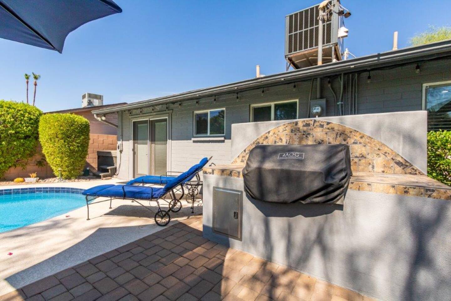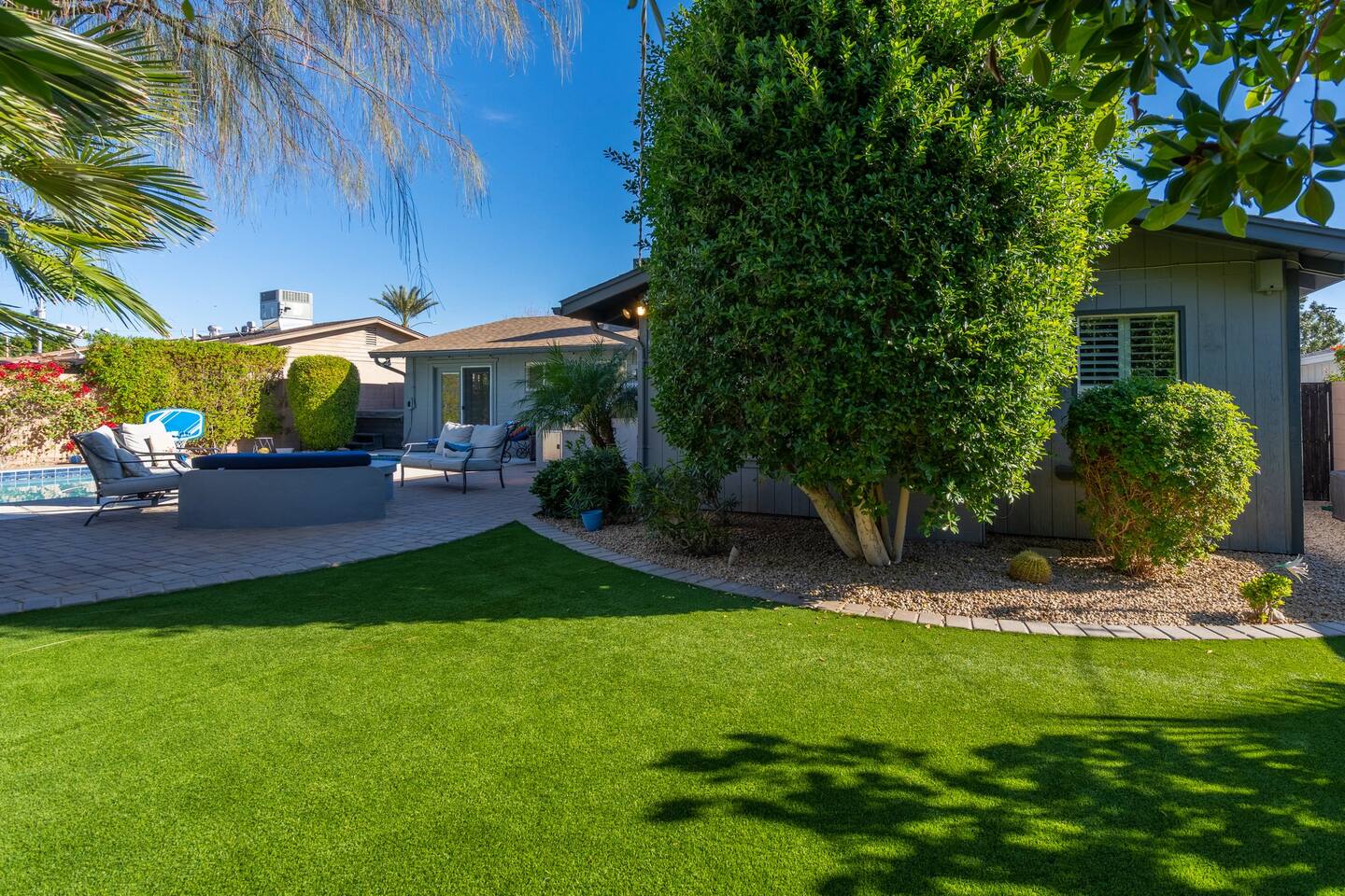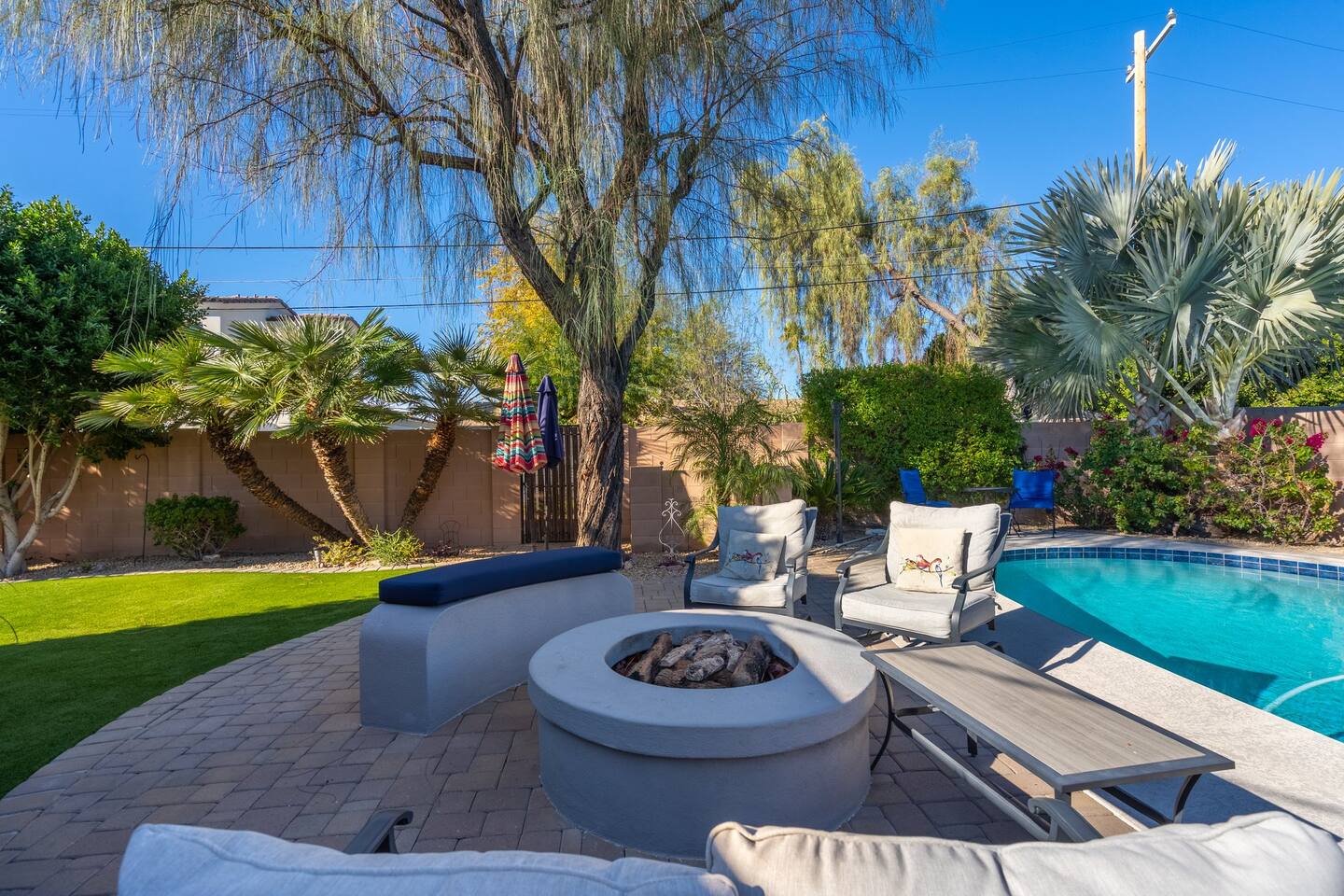 This inviting private residence has a covered carport, a 1-car garage and available parking on the street without any needed passes. There is a front patio area with tables and seating in a relaxed environment. The door has an August Lock with keypad access. As you enter the home, you are invited into a warm space with a large dining table with with seating for 8 people and plenty of open space. There are 3 bedrooms to the right including a master bedroom with a king-sized bed, private bathroom with a shower, and large double doors opening directly out to the pool and back yard. The second bedroom has 2 queen-sized beds and the 3rd bedroom has a comfortable hide away bed couch and office space. The home also has a roll-away twin bed as well available. All the rooms have 43-inch Samsung Smart TVs and Amazon Echos which can be used separately or linked together. The TV/Entertainment room has a 65-inch Samsung Smart TV with a VIZIO Elevate Home Theater Surround Sound, 2 comfortable theater chairs and a love-seat and sofa. There is also a bar area. The room has board games, karaoke and other fun items for kids and adults. There is Gigablast Cox WiFi for all your working, gaming, and internet needs. The kitchen is modern and updated with gas burners and all that you would expect for preparing meals and entertaining. There is a laundry room with commercial size washer and dryer. The backyard has a large pool that is heated, jacuzzi, gas barbecue, fire pit with surrounding seating, Tiki torch, and is surrounded by well-manicured and appointed foliage and outdoor lighting. There are games as well for outside including a bean bag toss, large Jenga, and an available outdoor ping-pong table. *Important: Though our smart TVs have streaming apps installed (Netflix, Disney+, Amazon Prime), guests would need to log in with their own credentials. Please remember to logout of the apps at checkout. This is a great place for weekend getaways, entertaining and more! Registration #: 2024219 Per regulations, guests are not allowed to use the mailboxes on site. You may have Amazon packages delivered to the door and also use nearby post office boxes for mail. We would not be liable for any lost packages.