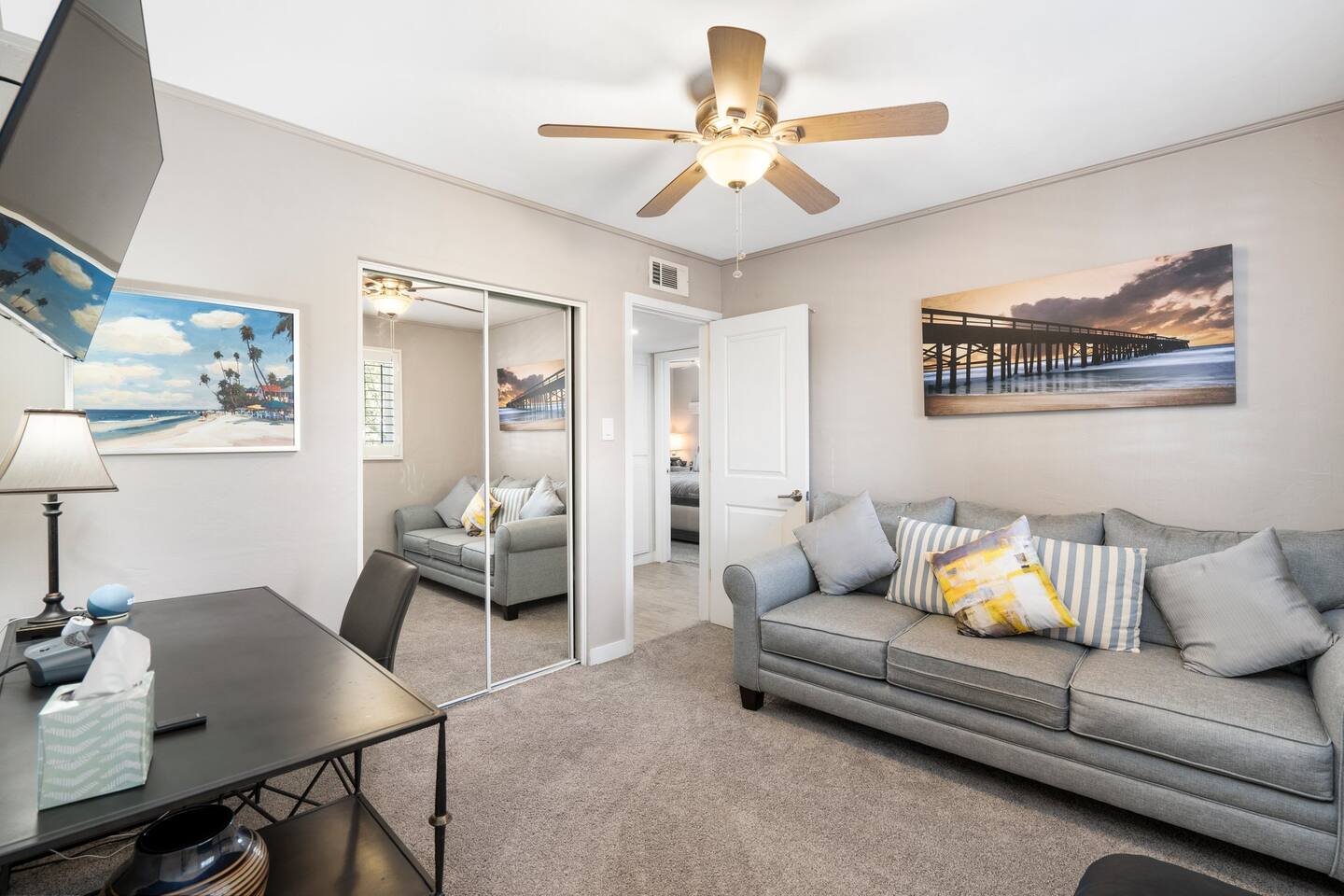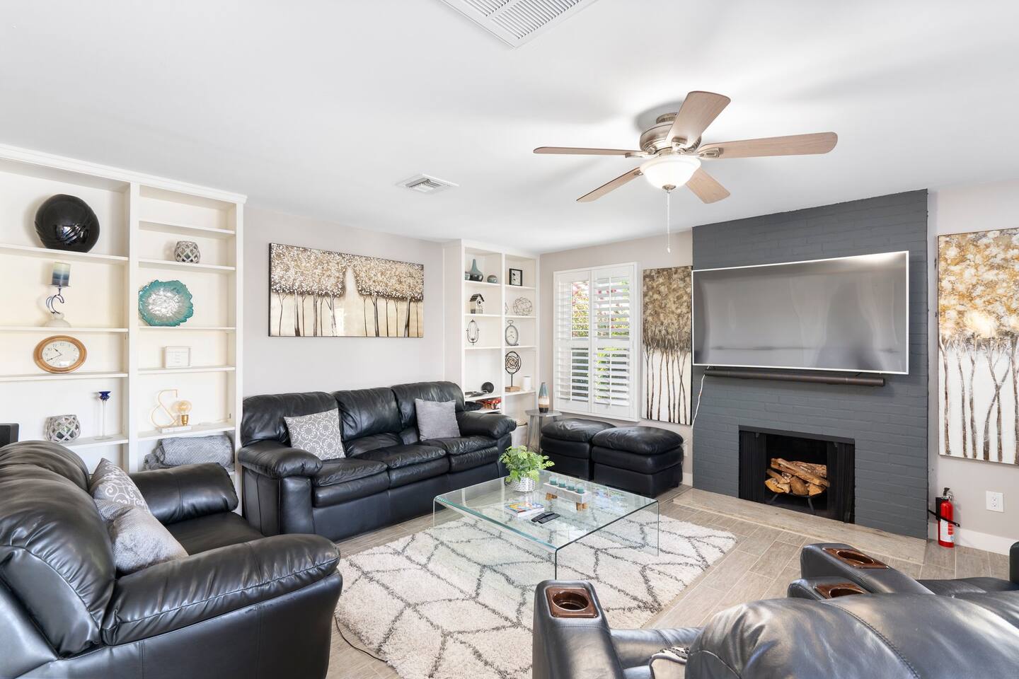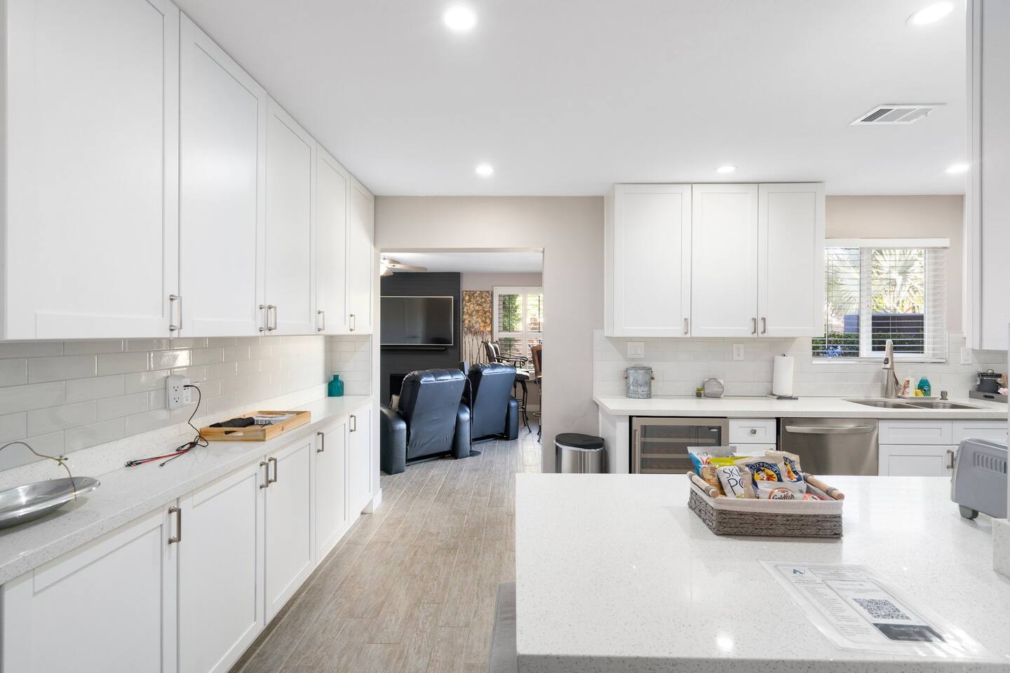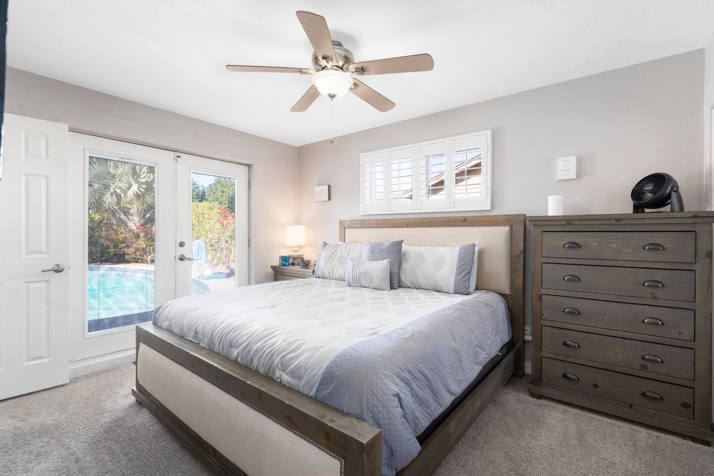 This inviting private residence has a covered carport, a 1-car garage and available parking on the street without any needed passes. There is a front patio area with tables and seating in a relaxed environment. The door has an August Lock with keypad access. As you enter the home, you are invited into a warm space with a large dining table with with seating for 8 people and plenty of open space. There are 3 bedrooms to the right including a master bedroom with a king-sized bed, private bathroom with a shower, and large double doors opening directly out to the pool and back yard. The second bedroom has 2 queen-sized beds and the 3rd bedroom has a comfortable hide away bed couch and office space. The home also has a roll-away twin bed as well available. All the rooms have 43-inch Samsung Smart TVs and Amazon Echos which can be used separately or linked together. The TV/Entertainment room has a 65-inch Samsung Smart TV with a VIZIO Elevate Home Theater Surround Sound, 2 comfortable theater chairs and a love-seat and sofa. There is also a bar area. The room has board games, karaoke and other fun items for kids and adults. There is Gigablast Cox WiFi for all your working, gaming, and internet needs. The kitchen is modern and updated with gas burners and all that you would expect for preparing meals and entertaining. There is a laundry room with commercial size washer and dryer. The backyard has a large pool that is heated, jacuzzi, gas barbecue, fire pit with surrounding seating, Tiki torch, and is surrounded by well-manicured and appointed foliage and outdoor lighting. There are games as well for outside including a bean bag toss, large Jenga, and an available outdoor ping-pong table. *Important: Though our smart TVs have streaming apps installed (Netflix, Disney+, Amazon Prime), guests would need to log in with their own credentials. Please remember to logout of the apps at checkout. This is a great place for weekend getaways, entertaining and more! Registration #: 2024219 Per regulations, guests are not allowed to use the mailboxes on site. You may have Amazon packages delivered to the door and also use nearby post office boxes for mail. We would not be liable for any lost packages.